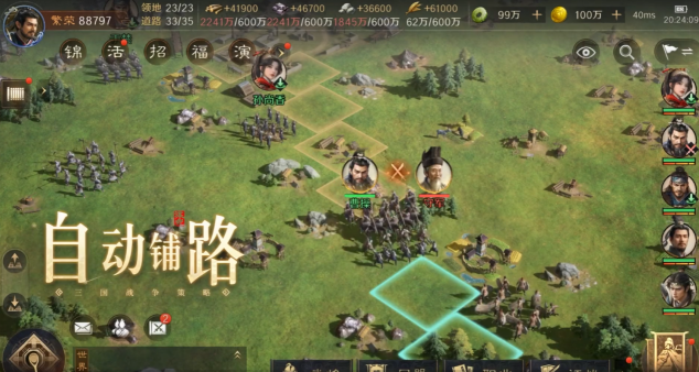 玩法中加入了随机武将强化与专属战场特性,每轮对战会随机刷新三名强力强化武将,搭配诸多战场特性,玩家需要通过巧妙配队联动特性加成,掌握战场主动权,彻底避免队伍同质化;各职业还新增了全新天赋,让职业玩法更灵活多变。此外,对局内武将等级、资源均已安排到位,武将补兵加速、重伤快速恢复、秒回城等设置拉满局内续航,玩家只需专注排兵布阵即可开战。而多线动态对抗的设计,运粮截粮、攻城守城等核心目标不断转换,带来了完全不同于传统SLG的快节奏战场爽快感,考验着玩家的极限策略。