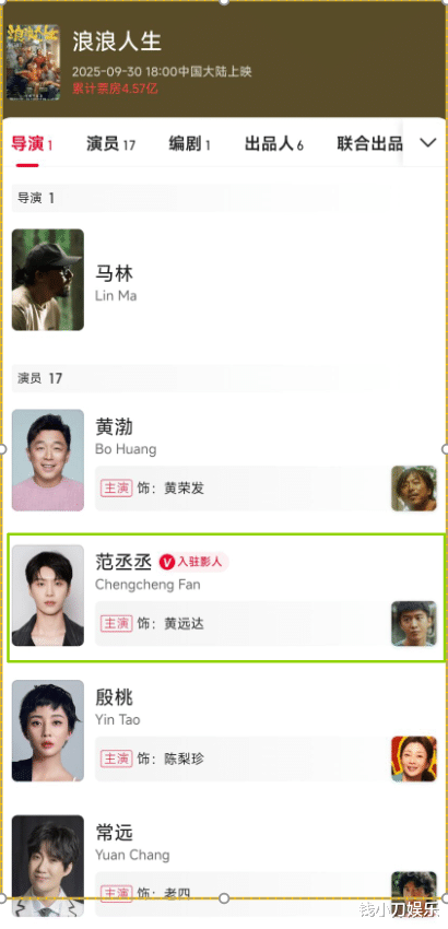 《浪浪人生》中,范丞丞是2番,紧跟在黄渤之后,这部影片票房是4.57亿。