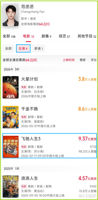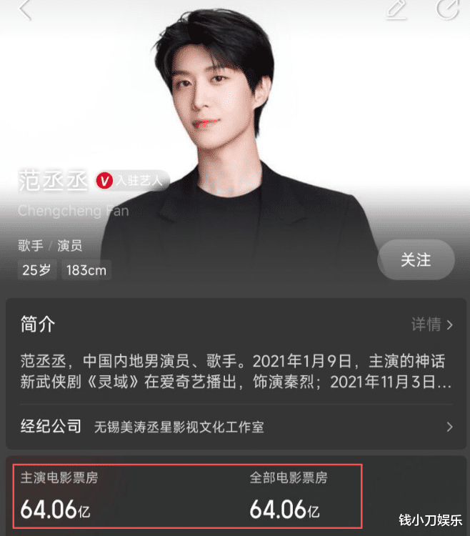 范丞丞的个人主页中赫然写着,主演电影票房64.06亿。