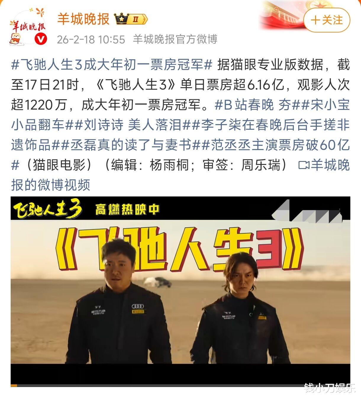 不过有人说,电影三番以内都算主演,那咱们再来看看其他6部的情况吧,先来看看正在热映的《飞驰人生3》。