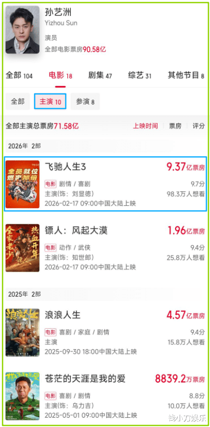 看了下排在范丞丞之后的孙艺洲,算是这部电影的8番,但他的个人主页里,《飞驰人生3》也算在主演范围内,他的累计主演票房有71亿,比范丞丞还高。