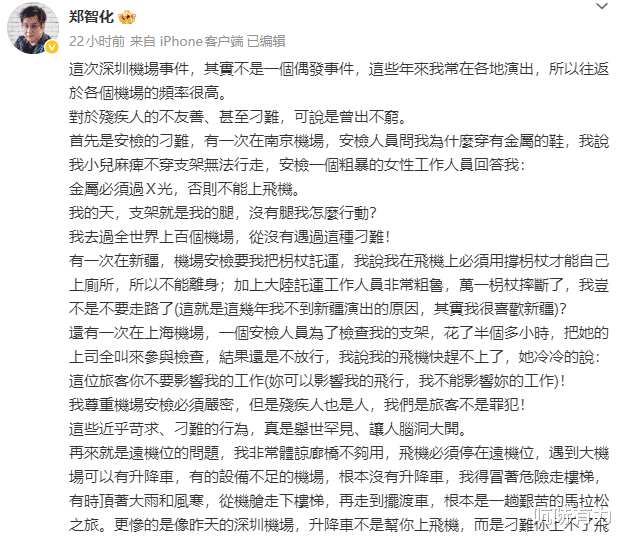 或许是为了找补自己的过激言论,接着,郑智化又发长文诉说这些年在各地机场遭遇的困境——南京机场要求他脱下金属支架、新疆机场要托运他的拐杖、上海机场检查他的支架半小时之久……
