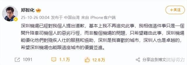 10月26日凌晨,郑智化再发博,先是对深圳机场的个人道歉表示接受,强调这“只是一个开升降车司机个人的恶劣行径”,并温和地希望机场能优化对残疾人士的服务。这与前一天的愤怒判若两人。