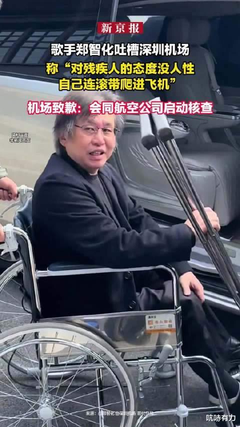 62岁的Beyond歌手郑智化在10月25日的微博上怒不可遏。他描述自己遭遇了飞行旅途中的惊魂一刻——轮椅卡在升降车与飞机门的25公分缝隙间,司机冷眼旁观,最终他只能“连滚带爬”进机舱。