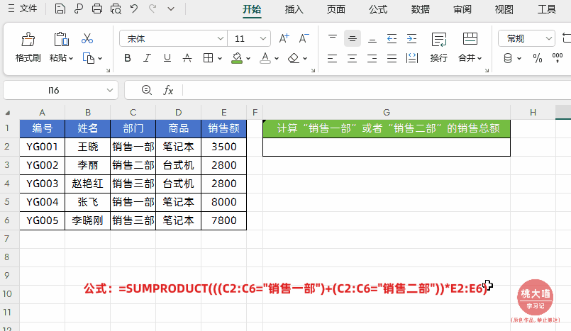 ②((C2:C6="销售一部")+(C2:C6="销售二部")):满足"销售一部"的返回1,满足"销售二部"的返回1,都不满足的返回0。只要结果大于等于1(即至少满足一个条件),就会与后面的数据相乘并参与求和。