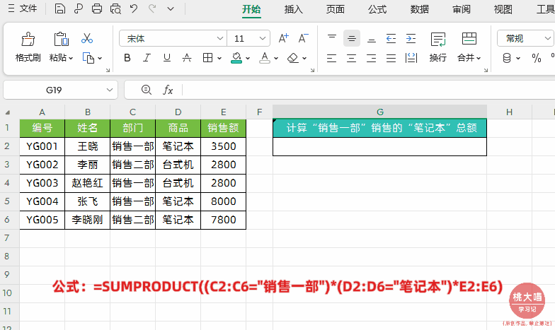 =SUMPRODUCT((C2:C6="销售一部")*(D2:D6="笔记本")*(E2:E6)*(F2:F6))