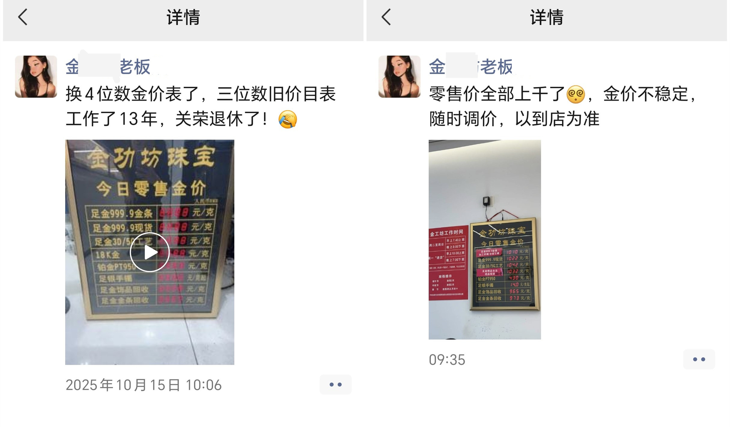 朋友圈一个金店老板已经换上了4位数的金价表,之前那块三位数的金价表用了整整13年,这下可以光荣退休了。