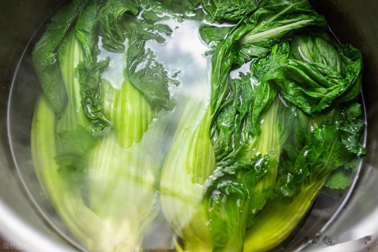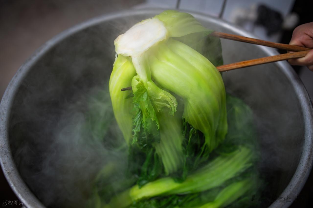 接着,找一口不沾过油的锅,比如专门煮粥的锅,往锅里面装入大半锅的水,大火煮开。水煮开之后开成中火,并把晾晒过的芥菜叶子放到开水中烫一下,菜叶被烫得翠绿之后马上捞出来沥干。待全部芥菜叶都被烫过一遍之后,就关火放凉那些烫菜水。