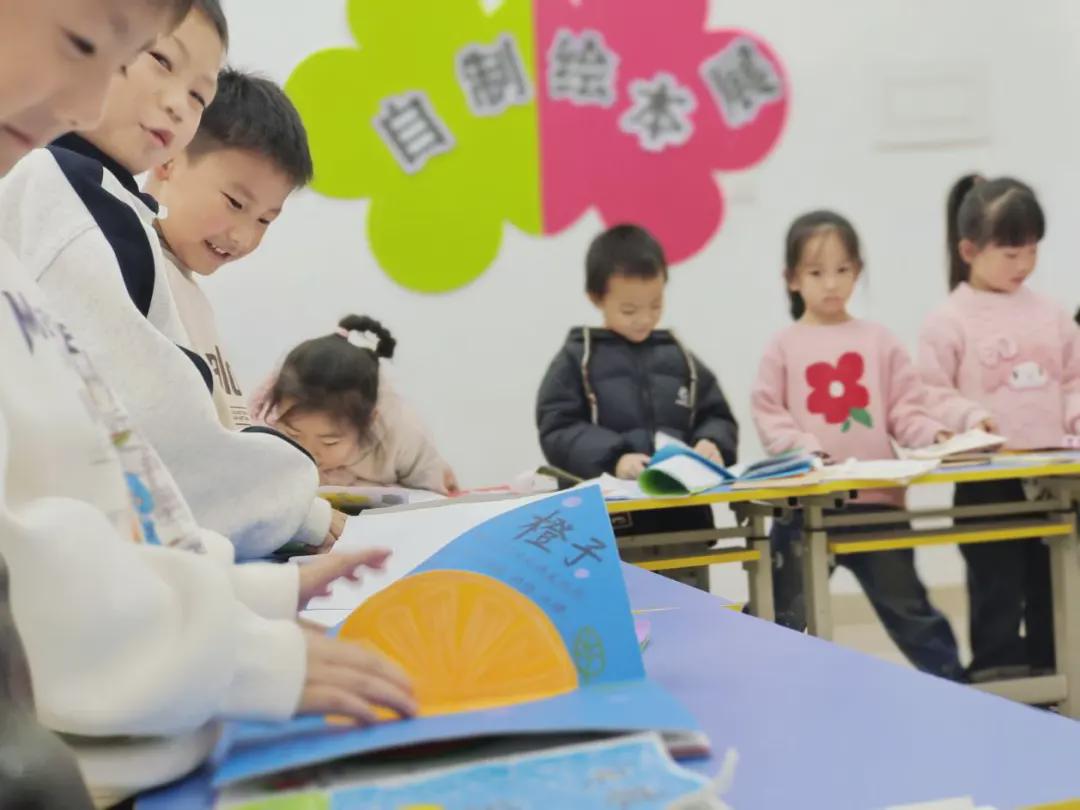 自制绘本汇集成了一个专属图书展区。小朋友们化身“小小读者”,围在展区里互相翻阅、细细品读,眼里满是好奇与喜爱,还忍不住和同伴分享书中的精彩情节,让书香在互动中悄悄传递。