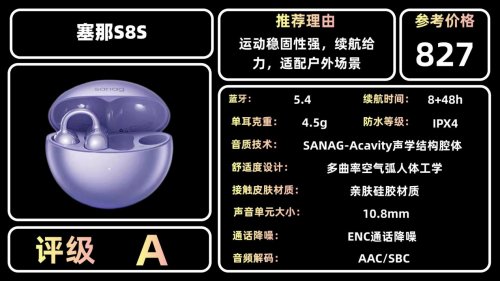塞 那S 8S主打的是运动场景,耳夹设计很稳固,夹力适中,跑步、跳绳这种剧烈运动时,也能牢牢贴合耳廓,不会掉下来,运动爱好者可以重点关注。机身支持防水防汗,平时运动出汗或者下雨天使用,都不用担心损坏,耐用性不错。