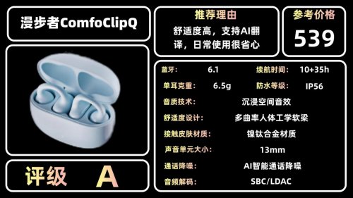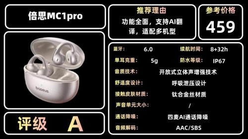 推荐理由:同价位性能天花板!佩戴稳、音质准、AI强,综合体验直逼千元机型