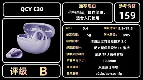 Q CY C 30是一款百元级的开放式耳机,价格很亲民,适合预算有限、想尝试开放式耳机的朋友入门使用。采用耳夹式设计,不用塞进耳道,戴起来很舒适,不会闷耳朵,单耳重量很轻,日常佩戴没什么负担。