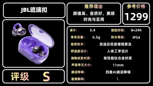 J BL这个牌子大家都不陌生,在音频领域口碑一直不错,这款琉 璃扣耳机主打的就是“可穿戴声饰”,把颜值和实用性结合得很好。机身是半透明的琉璃质感,还有好几种颜色可选,平时戴在耳朵上,就像个时尚配饰,搭配衣服很合适。单耳重量6.5克,不算重,耳夹用的是柔性TPU和记忆金属打造的C形结构,贴在耳朵上不压耳,就算连续戴5小时,也不会觉得不舒服,彻底摆脱了入耳式耳机的耳道压迫感。