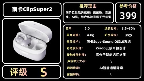 南卡有自己的开放式声学研发体系,调音这块一直很能打。ClipSuper2延续了旗舰级的声学配置,内置SuperSound OS3.0开放式声学系统,还有量子声频驱动2.0核心技术,经过多重算法调校,音质还原度很高,接近HiFi水平。不管是乐器的层次感,还是人声的细微变化,都能听得很清楚。耳机还配有NanoBass TiCeram-X双核声学引擎,旗舰动圈单元负责低频,TiCeram-X类钛金陶瓷复合振膜负责高频,三频表现很均衡,低音浑厚,高音清晰,人声也细腻干净,能看出南卡在声学技术上的硬实力。