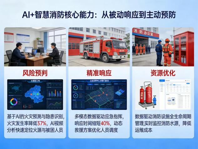 二、核心能力:从被动响应到主动预防的跨越AI+智慧消防的核心能力体现在风险预判、精准响应与资源优化三个方面,推动消防管理从“事后处置”向“事前预防”转型。