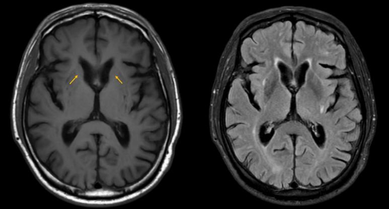 图3 头颅MRI+SWI:双侧尾状核头萎缩(左T1相,右FLAIR相)