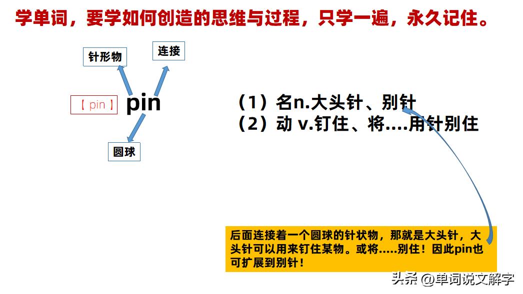 “大头针”大家都见过,就是针后面连接了一个圆球的针状物!针状物我们可以用p来表示,后面紧跟一个表示“连接”的n,再加一个可以表示“小圆球”的i,即可形成“pni”表达出“大头针”,但这样发音比较困难,因此调整成“pin”!详细解说图如下: