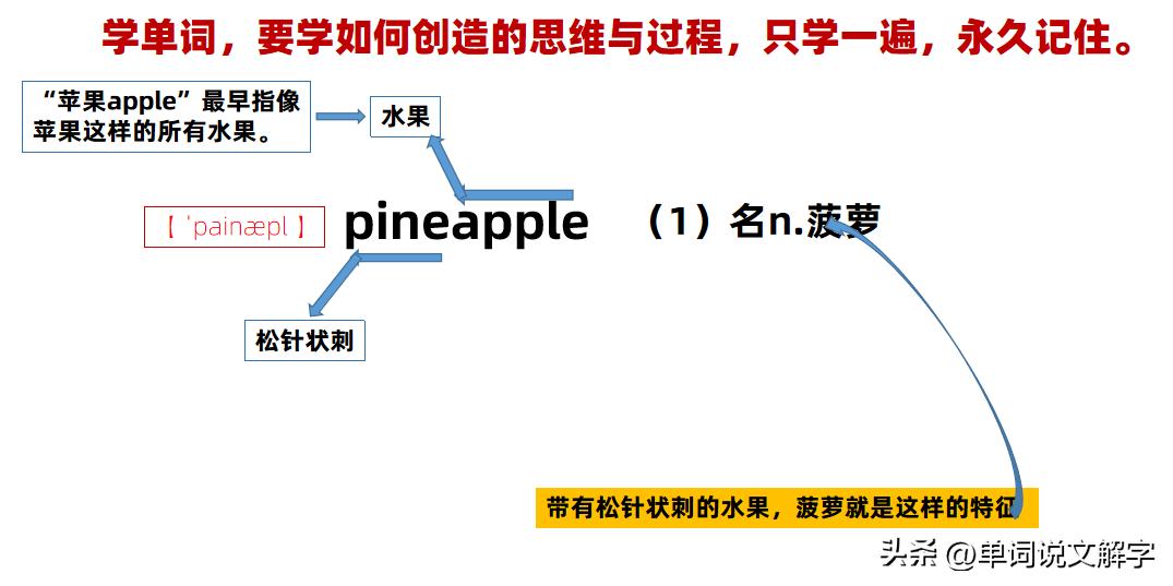 当我们知道“菠萝”是一种水果!知道“apple”最早是指所有的像苹果这样树上结的水果,因此“apple”有“水果”之意!因此创造“菠萝”这个单词时,可用“apple”!同时我们知道“菠萝”身上带有像“松针”一样的刺!因此“菠萝”这个单词只需要将“pine松针状刺”与“apple水果”进行组合即可!详细解说图如下: