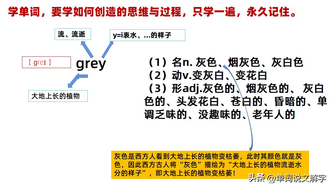 通过“葡萄grape”单词我们学会了,“gr”表达的含义!这样我们去学习“grey灰色”这个单词就会相当容易!因为灰色是西方人看到大地上长的植物变枯萎,此时其颜色就是灰色,因此西方古人将“灰色”描绘为“大地上长的植物流逝水分的样子”,即大地上长的植物变枯萎!因此可以首先写出表示“大地上长的植物”的“gr”,然后用表示“流逝水分的样子”的“ey”进行补充说明即可!详细解说图如下: