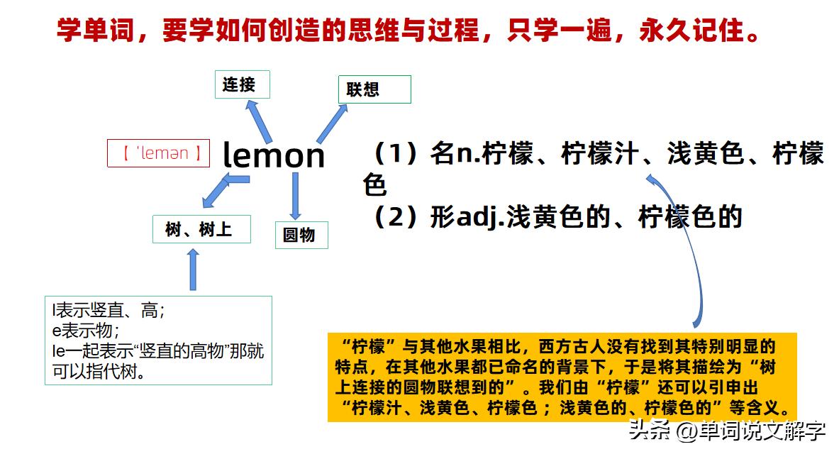 我们知道“apple”中的“ple”表示“树”,按照这样的思维,“le”也可以表示“树”,这样我们就可以创造“柠檬lemon”,但是大家一定要注意“柠檬lemon”创造思维!