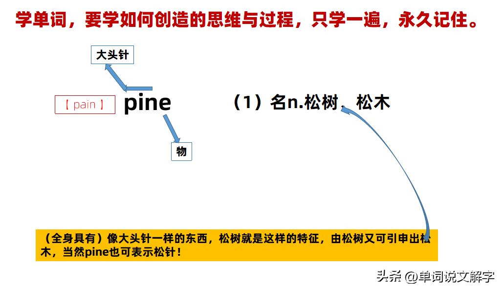 “pine”就是基于“pin”创造而来的,只要我们知道“松树”全身长着像大头针一样的刺!那我们就会有创造“pine”的思维!大家认真阅读解说图。