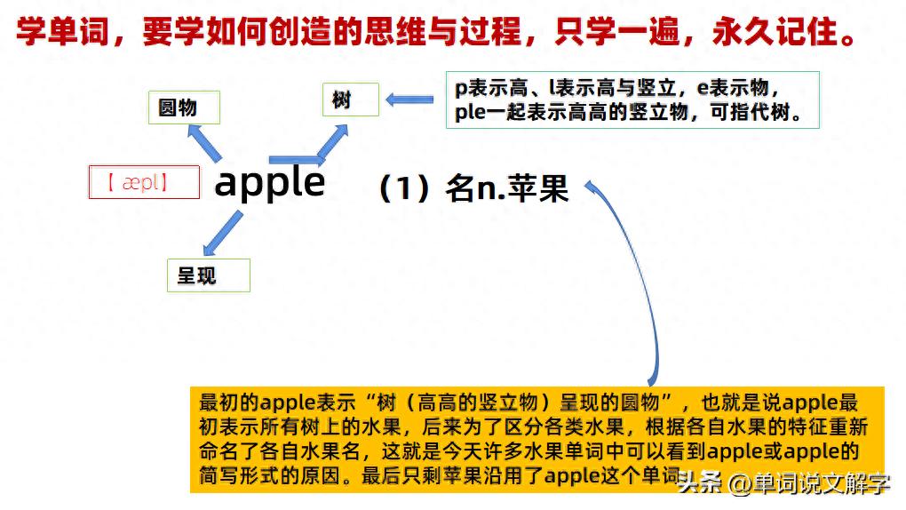 最初所有树上的水果都称为“apple”,它的本义是“树(高高的竖立物)呈现的圆物”,后来为了区分各类水果,根据各自水果的特征重新命名了各自水果名,这就是今天许多水果单词中可以看到apple或apple的简写形式的原因。最后只剩苹果沿用了apple这个单词。因此我们可以首先写出表示“圆物”的“a”,最后用表示“树呈现”的“pple”来补充说明即可!详细解说图如下:
