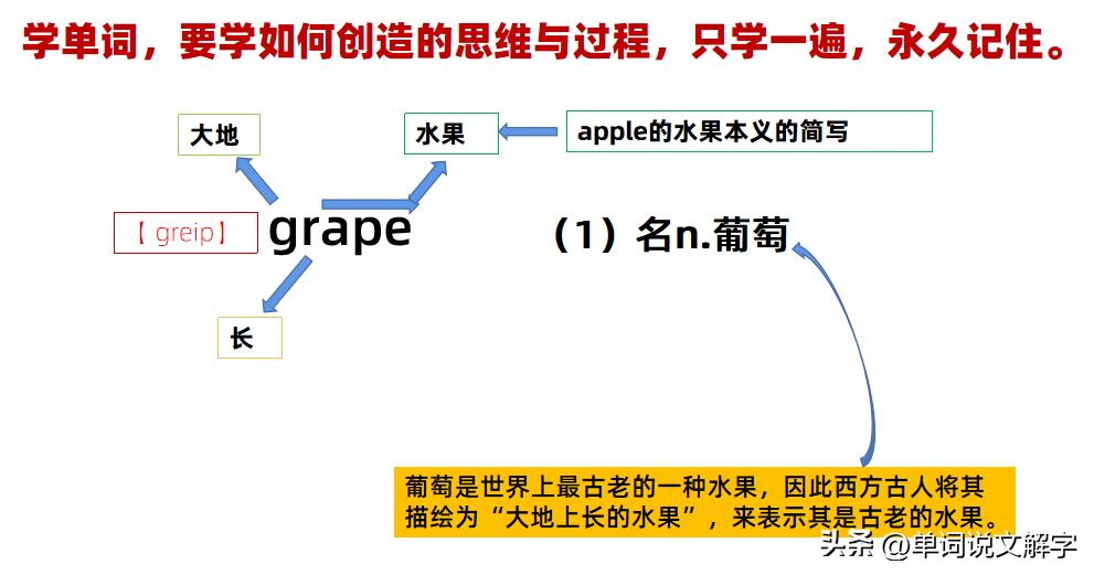 当我们知道“ape”其实就是“apple”的简写,表示“水果”之意,那么表示“大地上长的水果”的“grape”这句话只有“大地上长”没有表达出来!因此西方古人首先写出了表示“大地长”的“gr”,然后用表示“水果”的“apple”的简写“ape”进行补充大地上长的具体事物,最终形成了表示“大地上长的水果”这句话的“葡萄grape”。