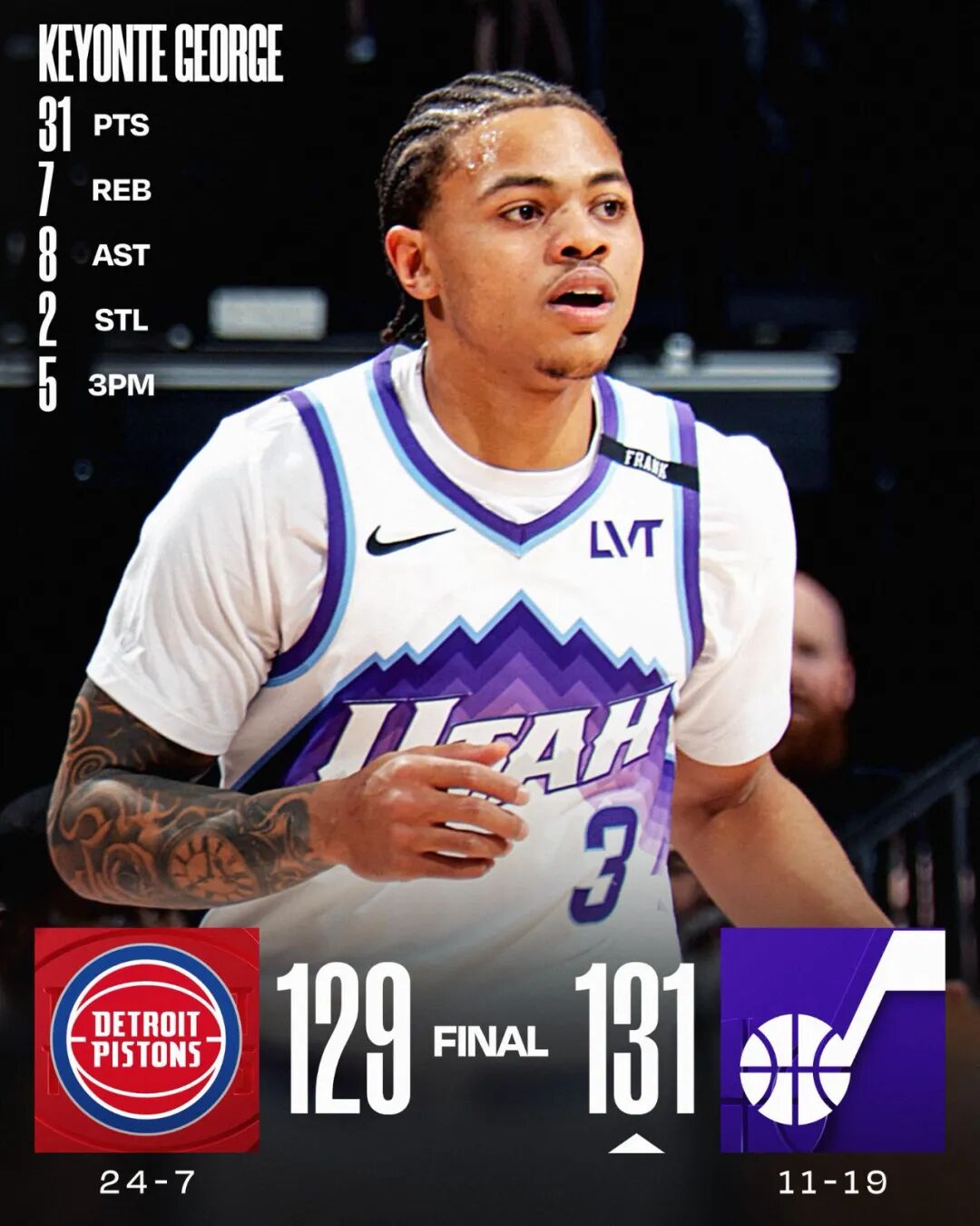 这场比赛,爵士当家后卫基扬特乔治再次打出了优秀表现:全场出战35分钟,投篮22中12,三分10中5,罚球2中2,得到31分7篮板8助攻2抢断,正负值+10。
