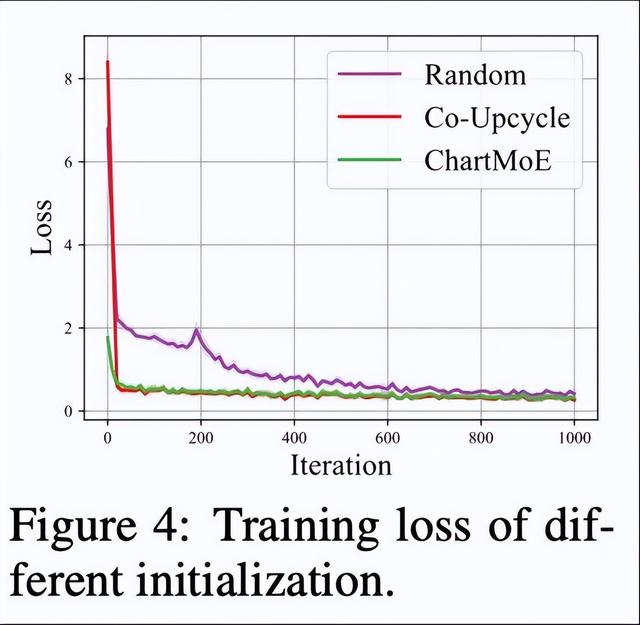 对比 Diversely Aligned MoE 与 Random 初始化、Co-Upcycle 初始化(即把通用 Connector 复制 N 份)的 Training Loss,我们发现,Diversely Aligned MoE 能够有更低的初始 loss(因为已经更好地学到了对齐到后续 LLM 的 chart 表征),以及整体更平滑的训练曲线。