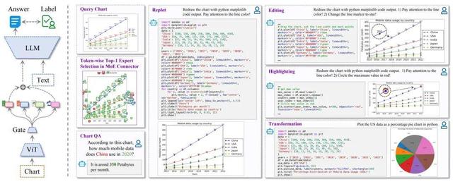 ChartMoE 是一个以 InternLM-XComposer2 模型为训练起点、引入 MoE Connector 结构的多模态大语言模型,具有先进的图表理解、图表重绘、图表编辑、重要部分高亮、转换图表类型等能力。ChartMoE 为图表(Chart)这种独特于自然图像的输入,设计了多阶段的图文对齐方式,每一个阶段产物都是 MoE Connector 中的一个专家,这样的训练方式和模型设计不仅能获得更全面的视觉表征、显著提高 MLLM 的图表理解能力,还可以在不加入通用数据的情景下,减少模型对通用知识的遗忘。