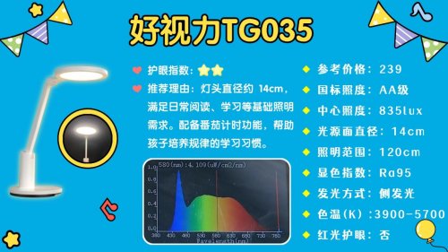 护眼灯哪个品牌最好用?好视力TG035护眼台灯外观为纯白色,设计比较简约。它采用直径14厘米的圆盘形发光面,光线能够覆盖一米左右的桌面区域。在功能方面,支持智能感光,可以自动根据环境光自动调整亮度;底座采用触控操作方式,支持三档色温与亮度调节。不过,从实际测试数据来看,蓝光峰值在1.0左右,数值偏高,长时间使用下需要注意用眼疲劳的问题。总的来说,它是一款功能基础、满足日常照明需求的台灯。