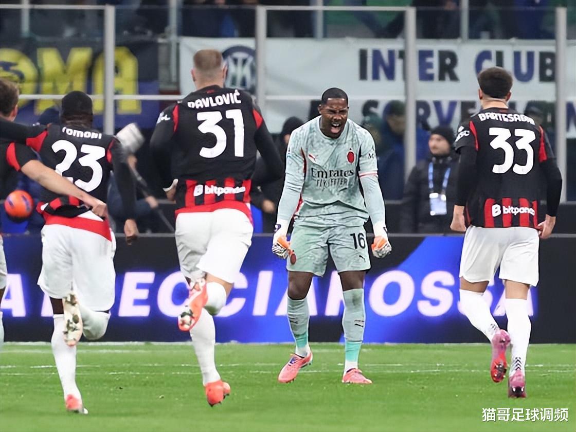 然而,比赛的转折点也伴随着红黑军团的犀利反击。克里斯蒂安·普利西奇在一次由阿莱克西斯·萨勒马科斯的快速反击中,展现了他作为前场尖刀的敏锐嗅觉,冷静推射破门,为AC米兰打破僵局。但比赛的悬念并未就此结束,国际米兰获得点球机会,哈坎·恰尔汗奥卢操刀主罚,但他们的射门再次被迈尼昂神勇扑出。这已是这位AC米兰队长本赛季第二次在关键比赛中扑出点球,此前他还曾扑出罗马队的迪巴拉的点球。