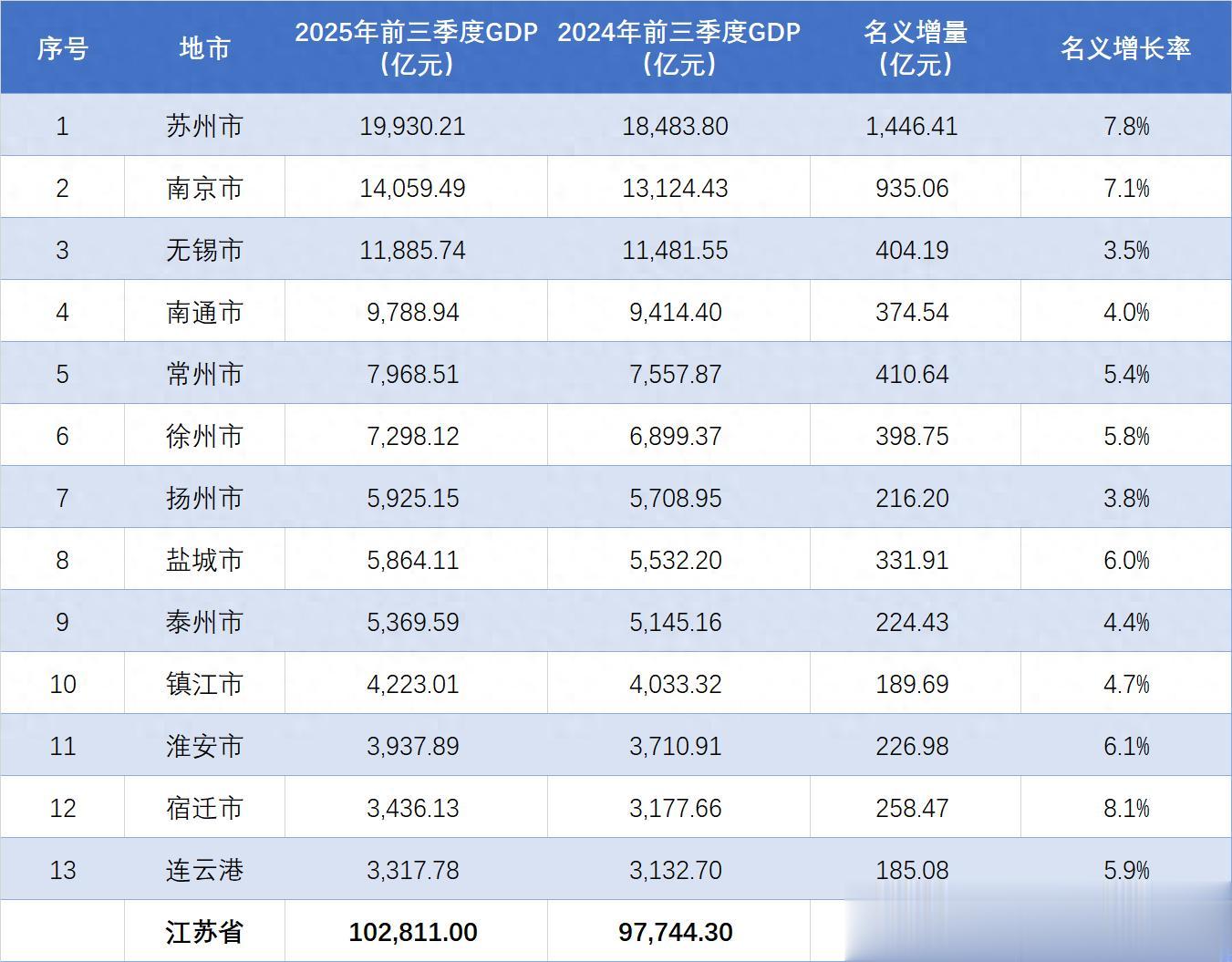江苏省是我国经济规模最大的省份之一,其GDP总额常年仅次广东,位居全国前二。2025年前三季度,江苏省GDP总值共计10.28万亿元,较上年同期增加5066.7亿元,名义增长率为5.2%,顺利跨过十万亿门槛。