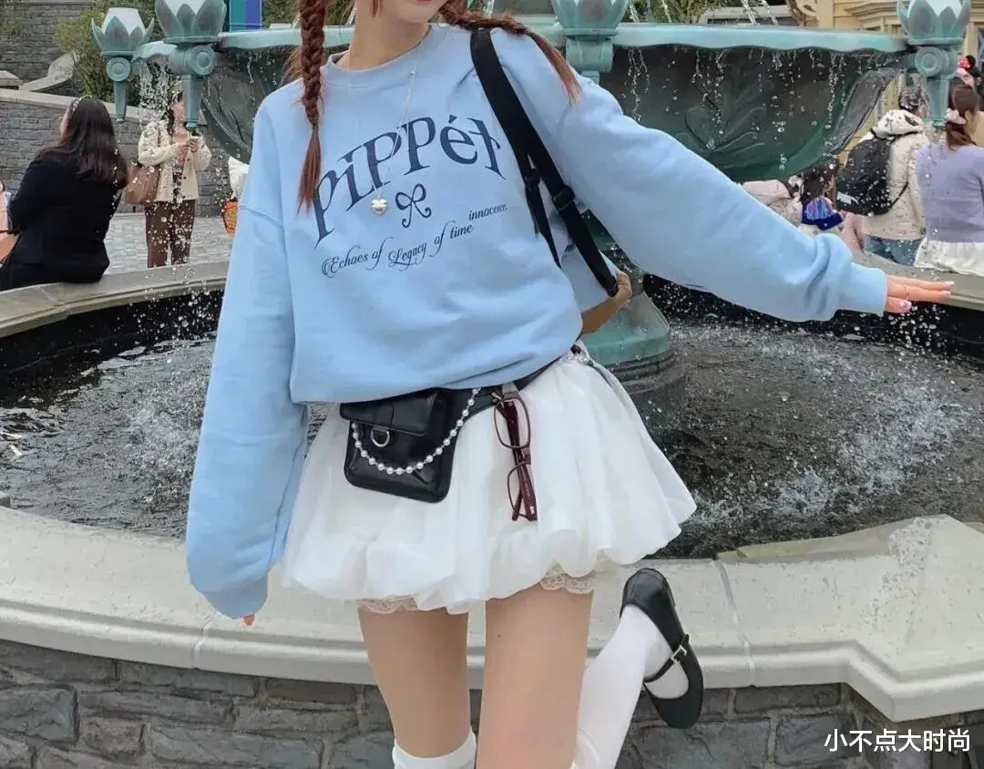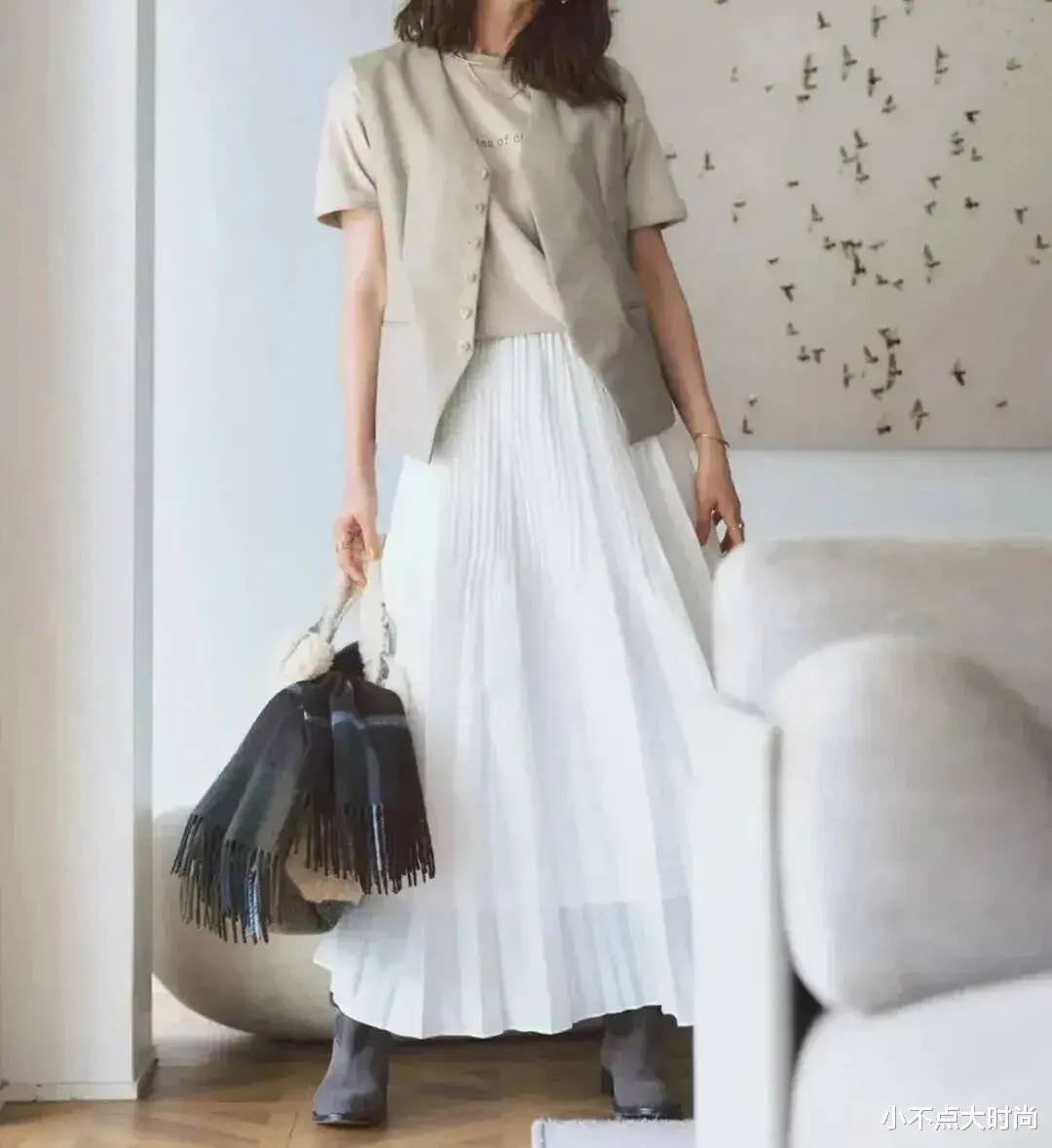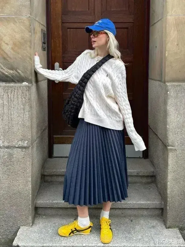 深色的高腰百褶裙搭配白色的毛衣,穿出了浪漫中带几分随性的时尚感,让女性的温柔优雅中也有休闲松弛的自如,舒服又高级,也很适合矮个子姐妹日常穿搭。▼