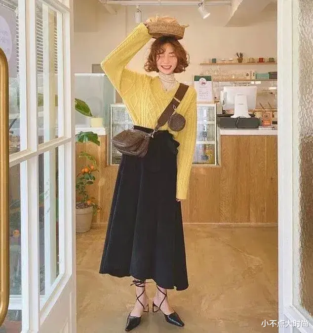黑色的高腰伞裙搭配黄色的毛衣,温柔大方,明媚又优雅的气质,舒张的时尚感,特别舒服讨喜、落落大方的一套气质穿搭。▼