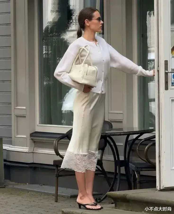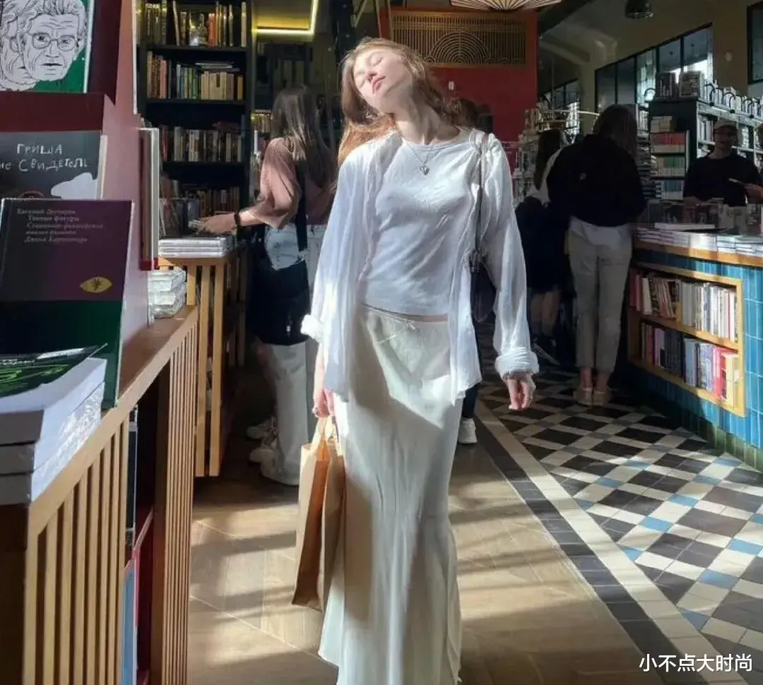 米白色的简约款高腰长裙,搭配同样是简约基础款的同色系上衣,一整个就很干净又高级的调调,清淡的气质太爱了。▼