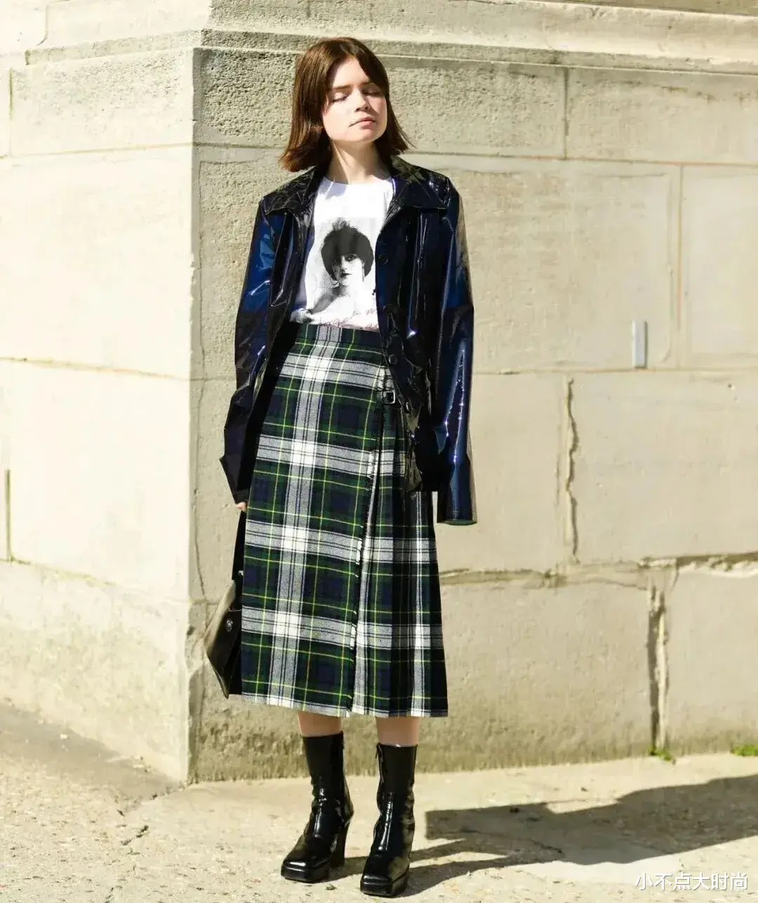 格纹的高腰直筒裙搭配白色印花T恤,外搭皮衣外套,一整套又飒又复古有腔调的穿搭,而且显高又显瘦,特别时尚。▼