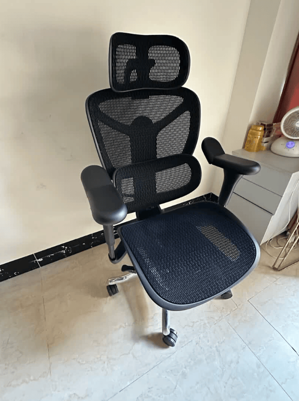 椅子是常见的工学椅造型,简洁不花哨,放在办公区很协调。腰靠的随动支撑用着很省心,不管是正坐办公还是后仰放松,腰部都能有贴合的支撑感。网布透气性确实不错,夏天久坐也不会觉得闷。调节功能很全,扶手多方向调节能适配打字、看屏幕等不同姿势,午休时拉出腿托、调后仰角度就能舒服歇会儿。稍微不足的是坐垫偏硬,而且腰部支撑位置偏上,骶骨部位承托稍显不足,另外椅子自重有点大,移动起来不算轻便,但整体用着挺顺手,能满足日常基本久坐需求。