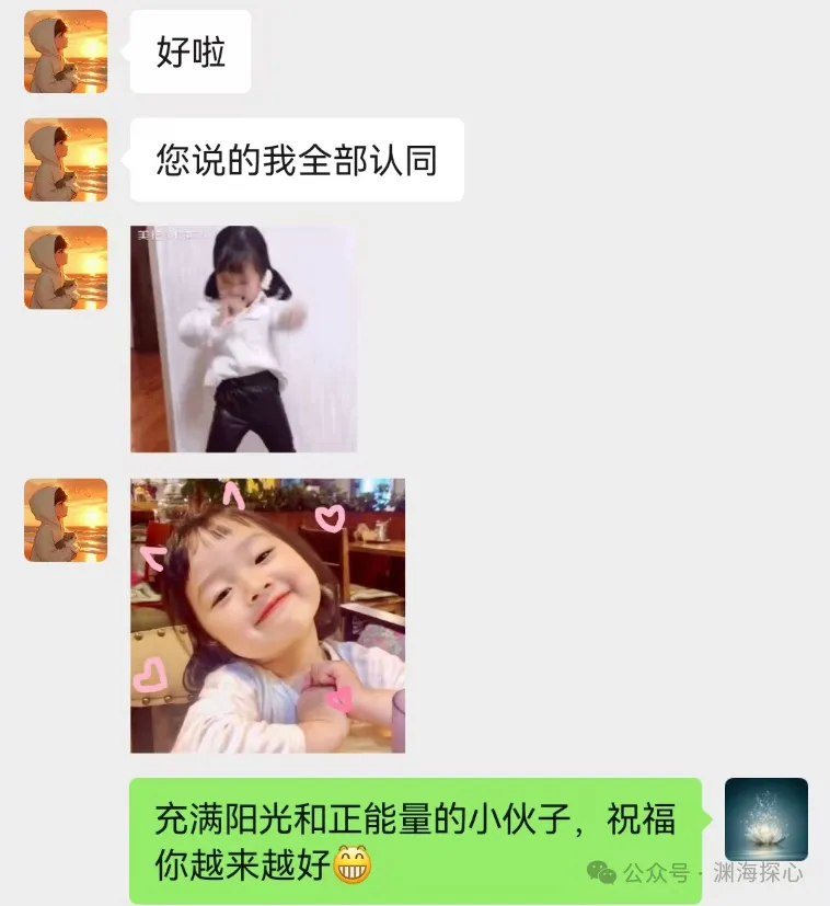 反馈:我当时选择这个头像的时候。首先这个头像,第一印象给我的感觉是温暖,和我的内心深处某种东西相契合,让我感觉很舒服,所以我选择了Ta。就像您说的,温暖、善良、有礼貌,内心渴望光明。我比较喜欢追求精神上的境界,看到一些好的文章,好的语句我会先抄下来,日后慢慢品味~内心敞亮,这个词我十分赞同。