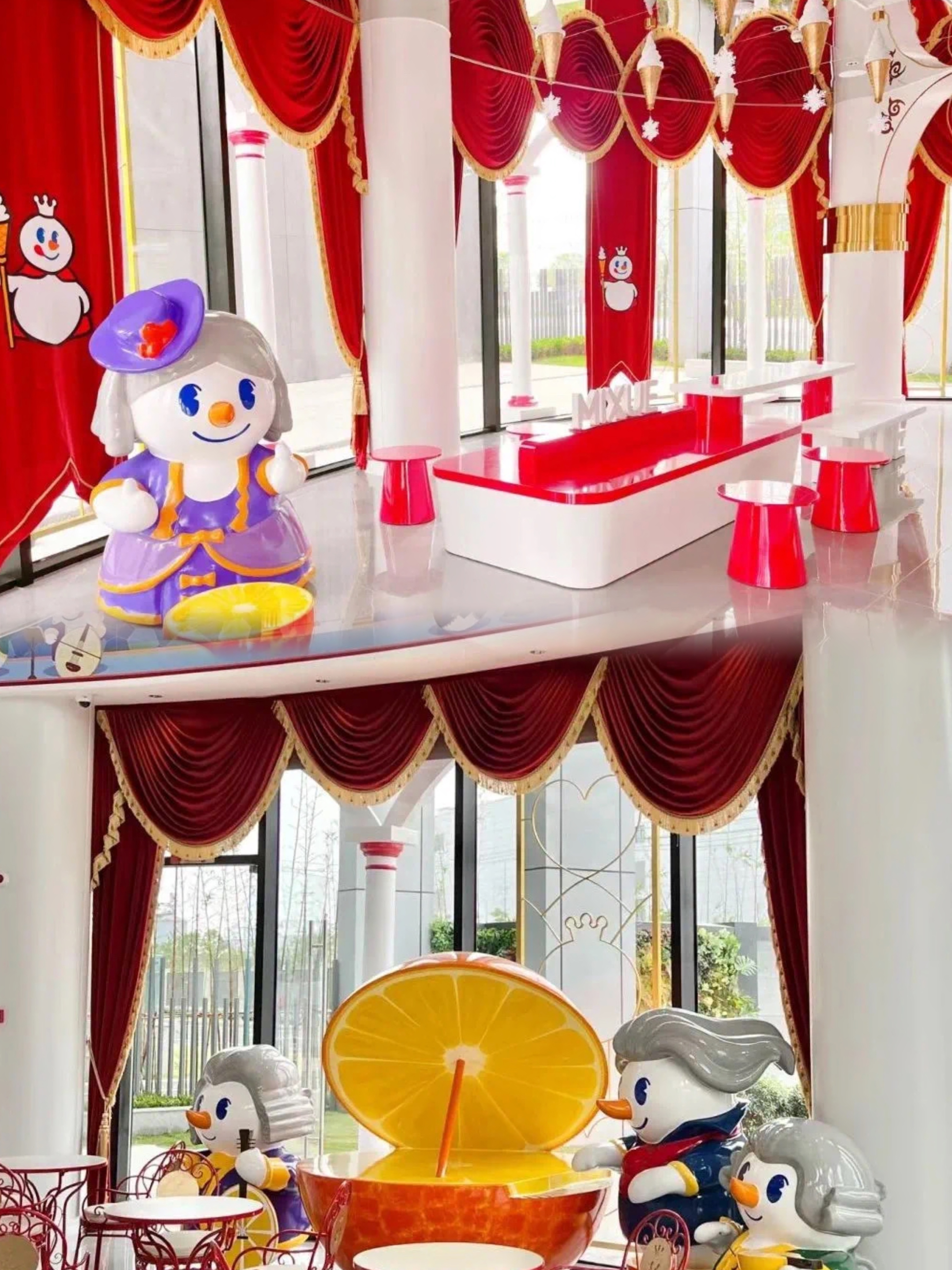 走进城堡内部,满目的明黄与大红色调相当的华丽、高端,无处不在的蜜雪冰城周边给人一种踏入雪王世界的感觉。其中还有不少身着华丽礼服的“雪王贵族”们的身影,他们或是在演奏、或是在跳舞,整个的就像是正在进行一场盛大的舞会等待游客们加入其中。