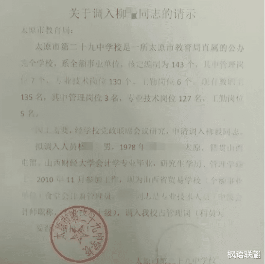 2019年12月,柳先生从山西省贸易学校被调入太原市第二十九中学;