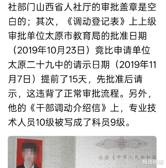 但很快他发现调动存在违规之处:审批日期比请示日期早了15天,即先批准后请示,关键的人社部门审批盖章处为空白、职称信息也被写错,从专业技术人员十级变成了科员九级;