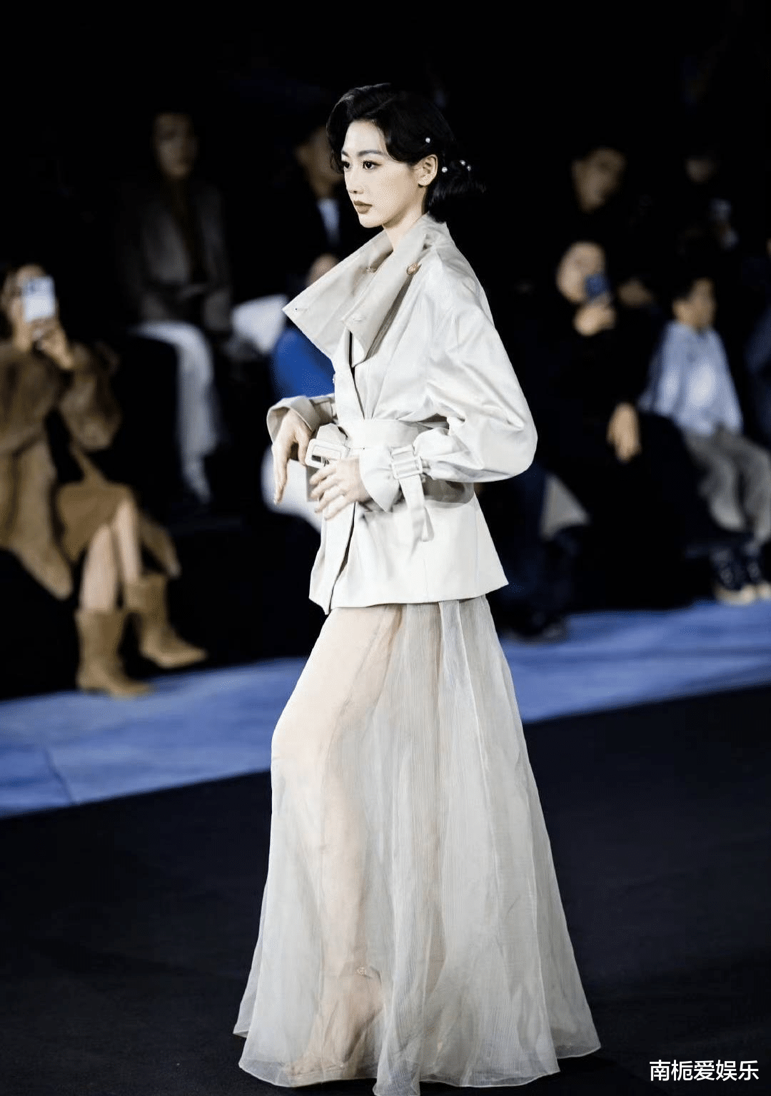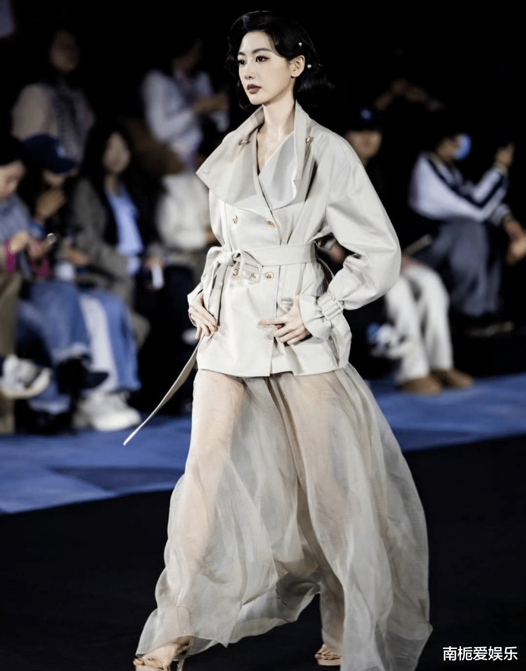 换装后的孙乐言,身穿浅色短款风衣搭配飘逸薄纱长裙,一头复古的“外卷头”造型瞬间将氛围感拉满。这种发型设计呼应了“职场反内卷”的潮流主题,慵懒中透着精致。虽然并非科班模特出身,但171cm的身高赋予了她得天独厚的优势。在T台上,她步态松弛有度,眼神坚定冷艳,与身边的职业模特同框也毫不逊色,被网友盛赞为“人群中发光的摩登女郎”。