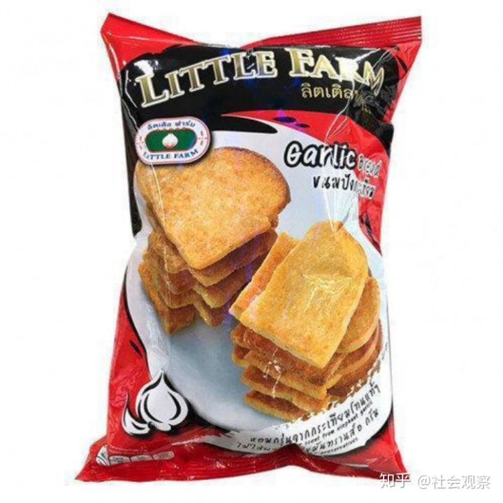 另一种美味但奇怪的小吃:小农场蒜蓉面包,至少听起来比较古怪,一包小而脆的蒜蓉黄油吐司,实在是难以抗拒。每袋100克的蒜味面包是所有口味中最可口的,但是如果你感兴趣的话,也会有黄油、汤米和黑胡椒等多种选择。