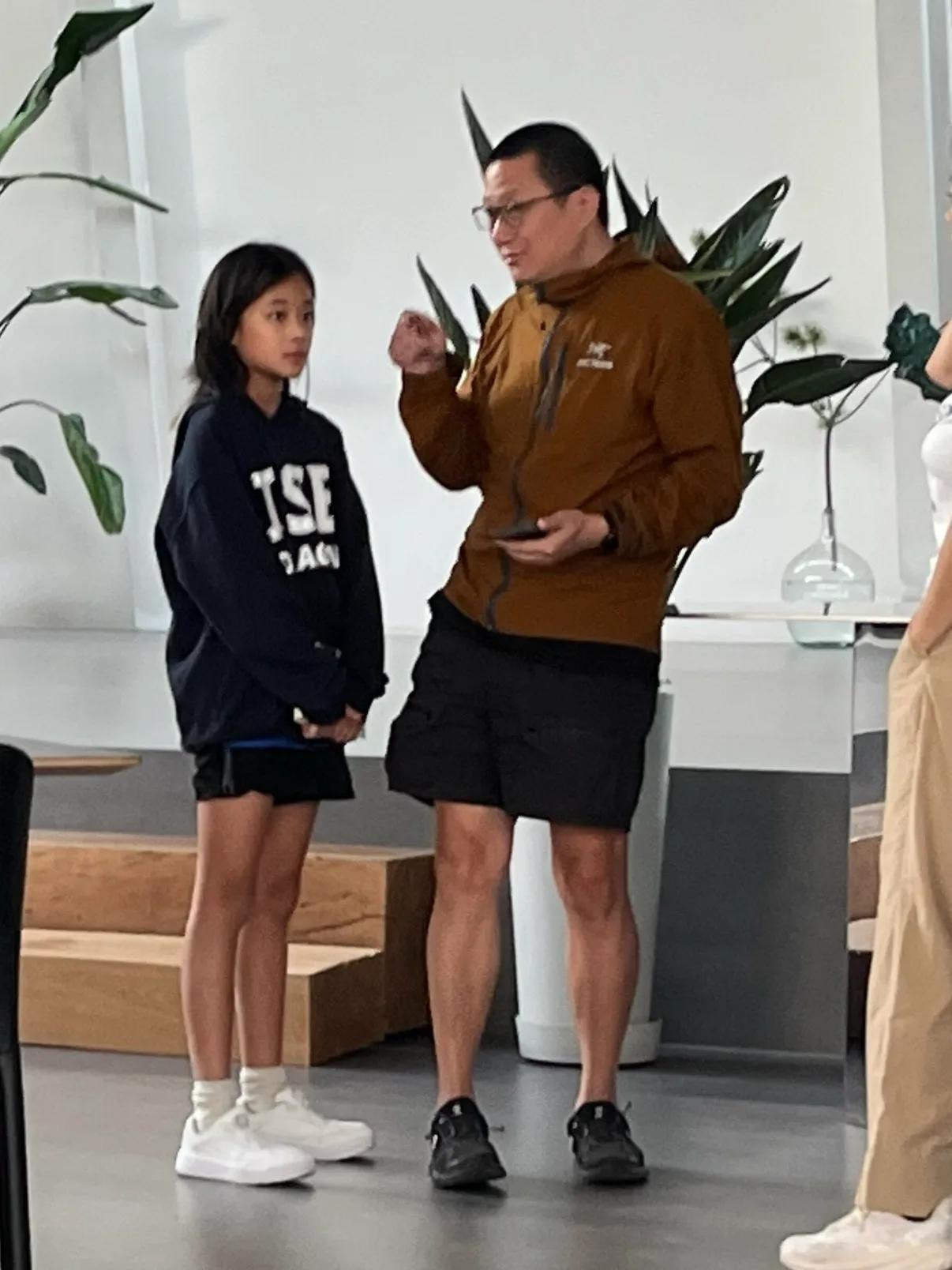 照片中,曾剑身穿棕色外套搭配黑色短裤,运动休闲装打扮看起来十分低调。曾剑是有名的摄影师、剪辑师,但因为基本都是在幕后工作,所以可能认识他的人不算特别多。他顶着寸头发型,戴着黑框眼镜,感觉就像普通人一样,如果不是女儿快快在身边,估计都很难被人注意到并认出来,毕竟女儿已经出演过很多电影啦。