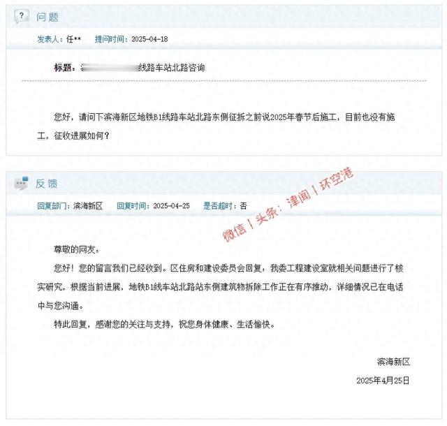 近日,有网友咨询天津轨道交通B1线车站北路站拆迁进展问题,官方回复一览。(北方网)