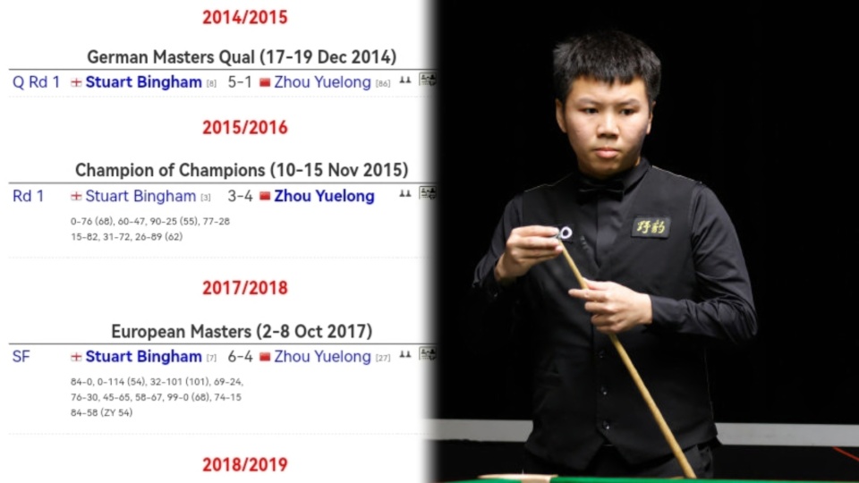 14年德国大师赛资格赛:周跃龙1-5宾汉姆15年冠中冠第一轮:周跃龙4-3宾汉姆