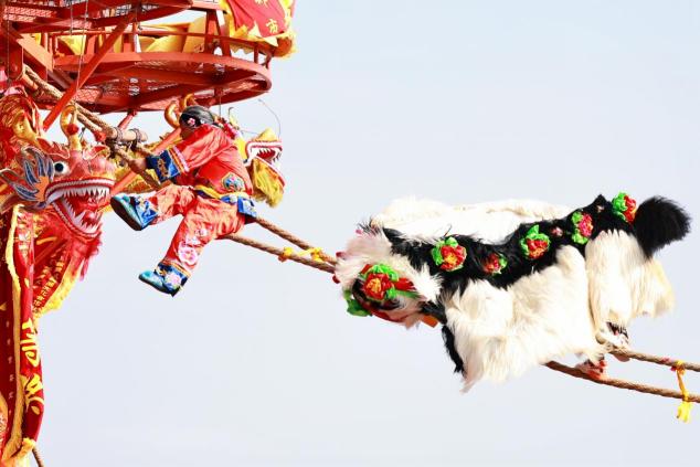 开幕式上,有着200多年历史的十里铺村舞狮腾挪转跳、扑跃挑首,将现场氛围推向高潮。这支队伍集北方民间舞狮的铜器打击乐、武术与艺术表演于一体,8面打鼓引领的铜器打击乐气势磅礴,地摊舞狮武技精妙,高空沿绳惊险刺激,架顶狮舞腾挪跳跃,彰显出中原地区民间舞狮艺术粗犷豪放、博大精深的无穷魅力。