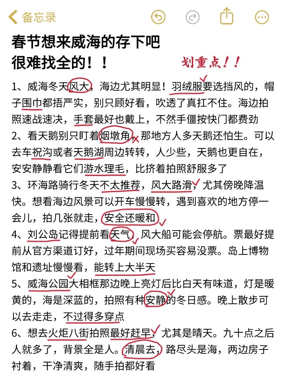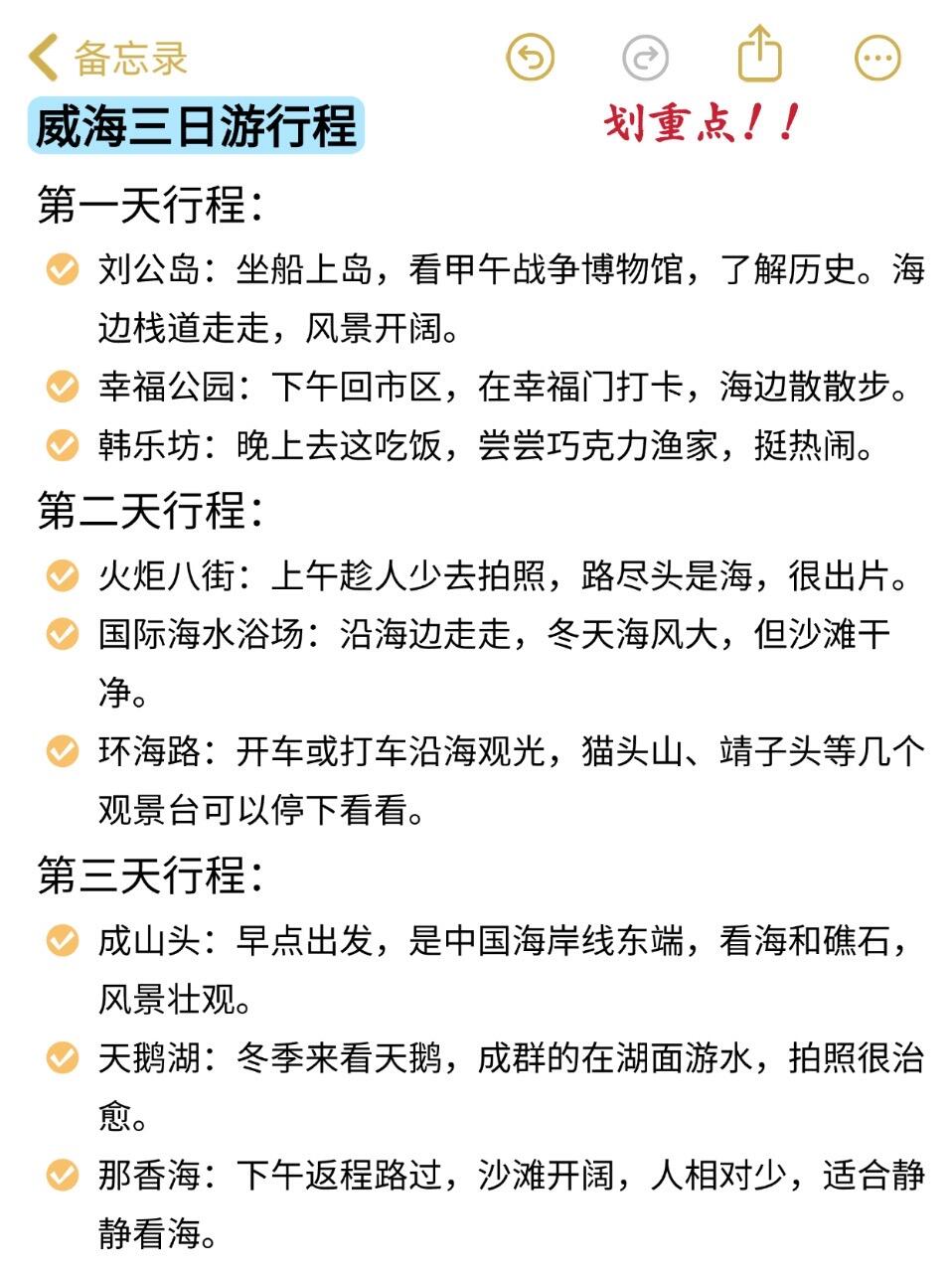✅️第三天:一早就出发去成山头🌅,这里是海岸线东端,海景开阔,礁石形状很有特色,风吹浪打的样子挺震撼。接着去了天鹅湖🦢,冬天这里聚集了好多天鹅,白白的一片在水面上,安安静静看着它们游水理毛,心情都变柔和了。下午去了那香海🌊,沙滩很长,人也不多。坐在海边发发呆,听听浪声,结束三天的行程刚好。傍晚光线柔和,拍照也挺出片的。