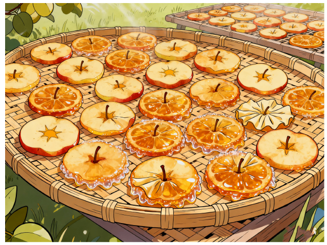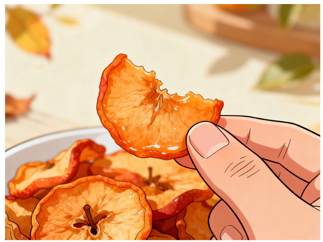 沙果切片躺在竹筛晒场,化身无数轮迷你小太阳,暖风为它们镀上琥珀光泽,糖分凝成晶莹的糖霜披风,每道皱褶都是储存阳光的密语。